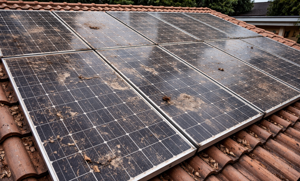 Visible dirt, bird droppings, or residue on panels